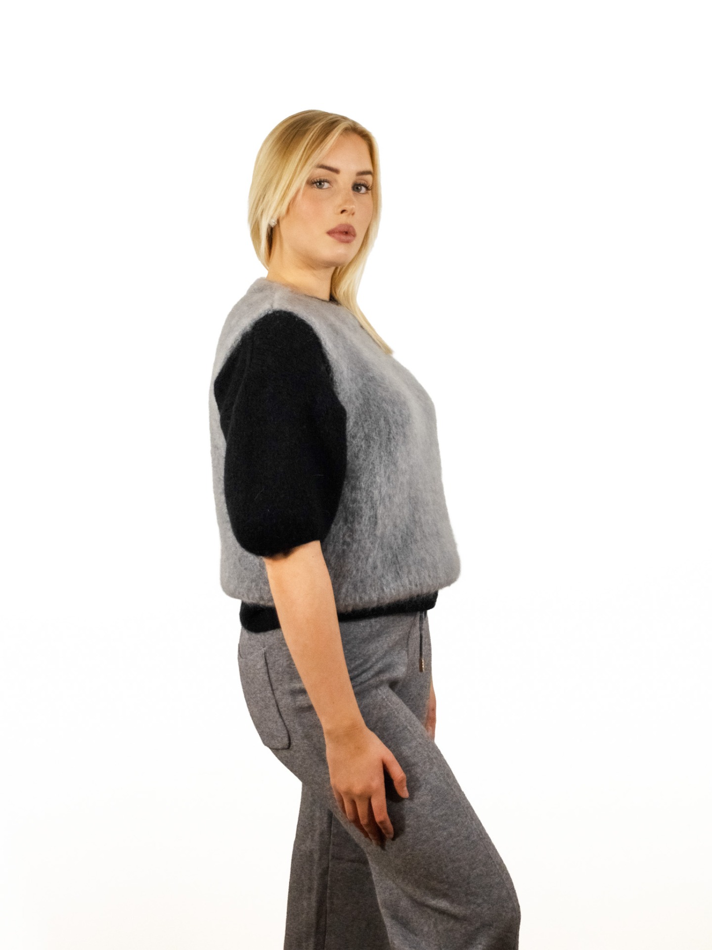 Acquista il completo con maglione smanicato grigio, maglione leggero nero con manica a 3/4 e pantaloni morbidi grigi.