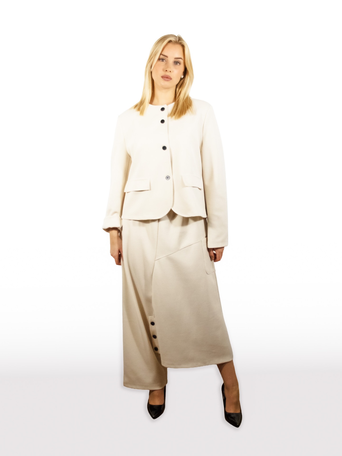 Completo donna, camicia e gonna lunga bianca.